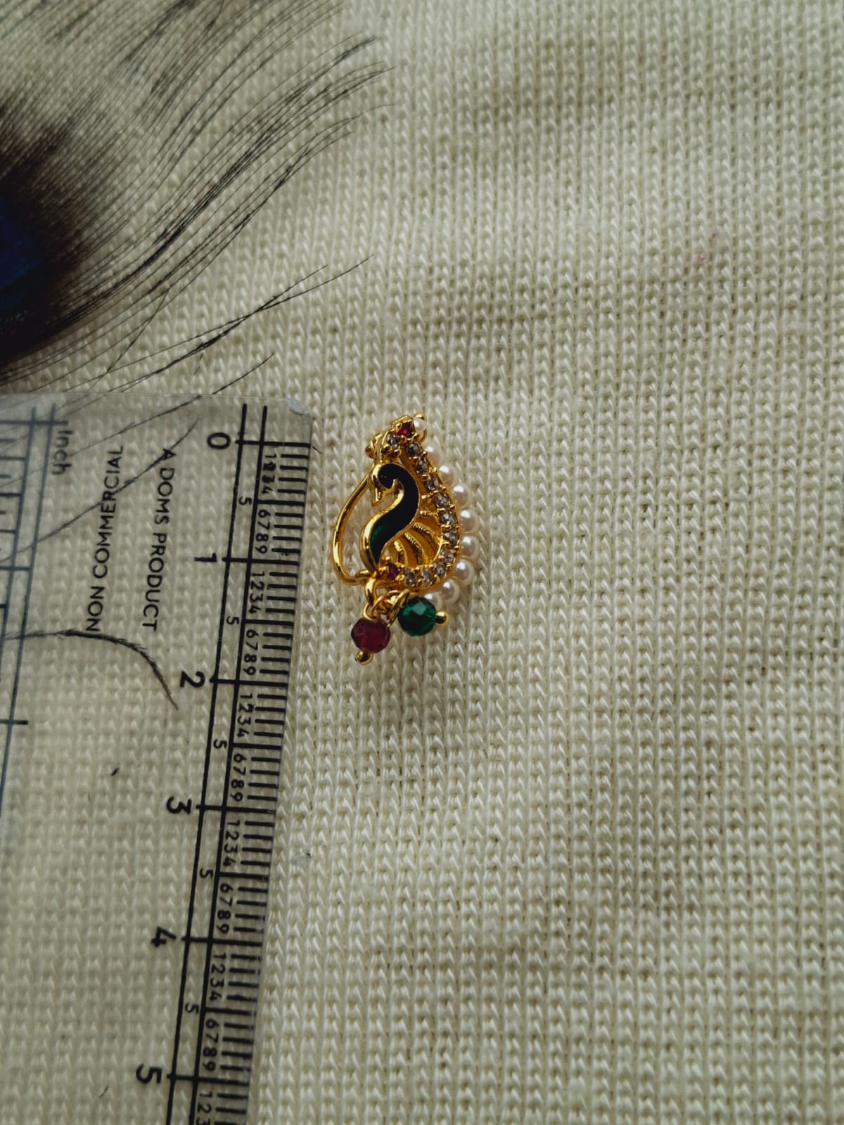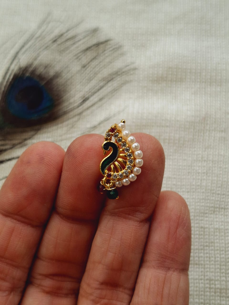 Nath is a traditional Maharashtrian ornament. However, over the past decade, the popularity of this ornament has spread far & wide nationally as well as internationally. Nowadays, the Nath is available in various designs & colors. This is a classical pearl Nath that looks good on any attire.