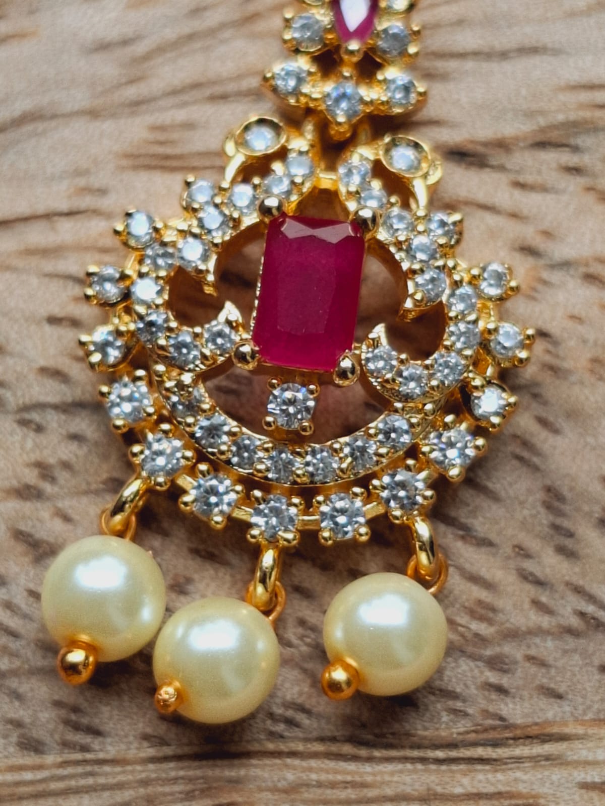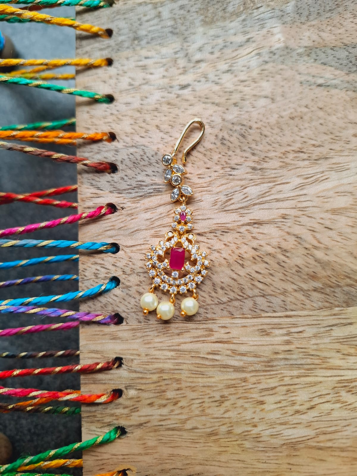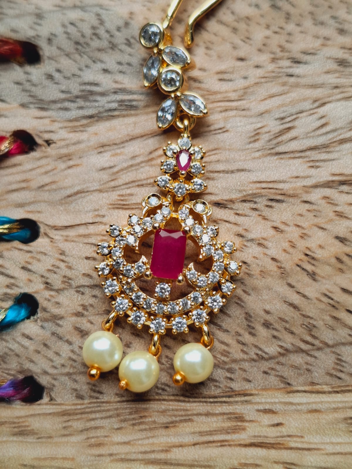 A maang tikka Which is also called Bindi in Marathi is a traditional piece of head jewellery that is worn by South Asian women on their wedding day or for other significant cultural events. It is a centrepiece that is latched onto the forehead, attached to a chain that is pinned into the hair.