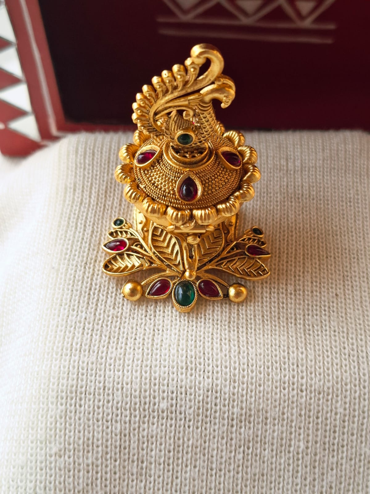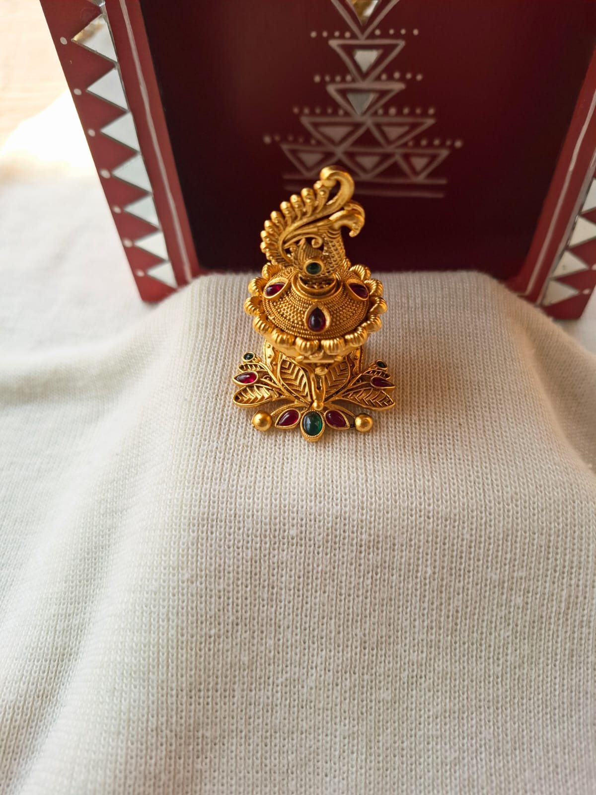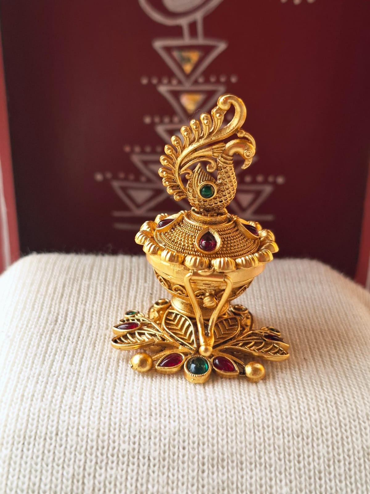This is one of the Best product for gifting. The base material for this is copper and on that there is plating. Our karagir has done the best job ever for carving this. One doubt which usually people ask that 'Can we keep kumkum in this? Because Kumkum these days contain lot of chemical and due to chemical reaction the polish might fade away.' To this we reply 'Generally no reaction occurs. But to be on the safer side you can put kumkum in this only for the function time. Rest all thetimeit can be kept empty and in ziplock plastic bag.
