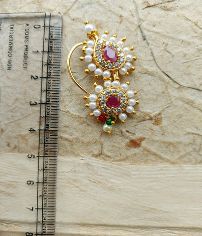Nath is traditional maharasthrian design but over the period the popularity of Nath has gone on national as well as international level. There are now a days various designs and various colour combintions in Nath. There are various types of nath as well. This is a Classic Pearl Nath which look good on any kind of attire. Generally looks good on oval face.