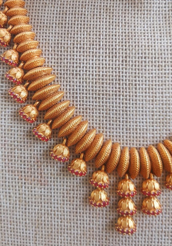 Ornate gold-toned designer necklace with intricate and detailed craftsmanship, featuring a repeating pattern of cylindrical beads and decorative pendant drops, against a neutral textured background.