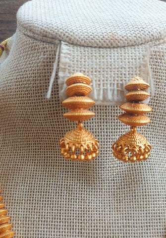 Elegant gold-toned designer zhumki (traditional Indian earrings) displayed on a white mesh necklace stand.