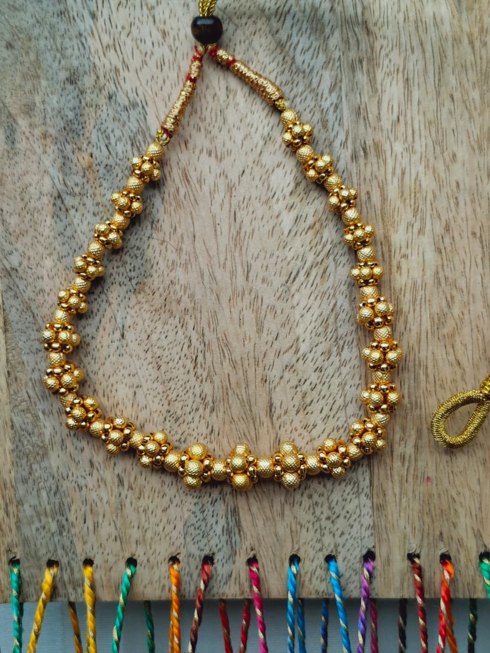 Thushi is a choker style neckpiece woven with the gold beads very closely. It comes with an adjustable dori so that you can adjust it according to your neck. It looks nice when teamed with paithani saree. Now a days therre are different designs in Thushi. Thushi Mangalsutras are also very popular.
