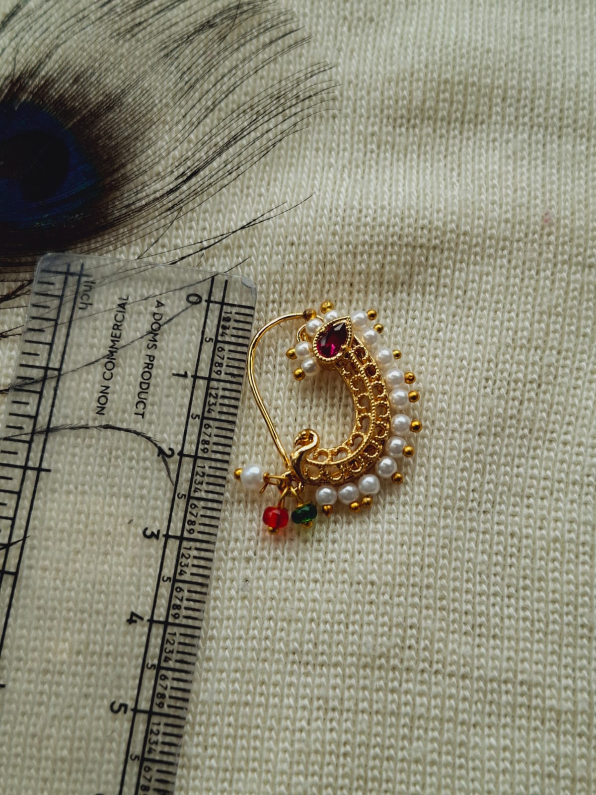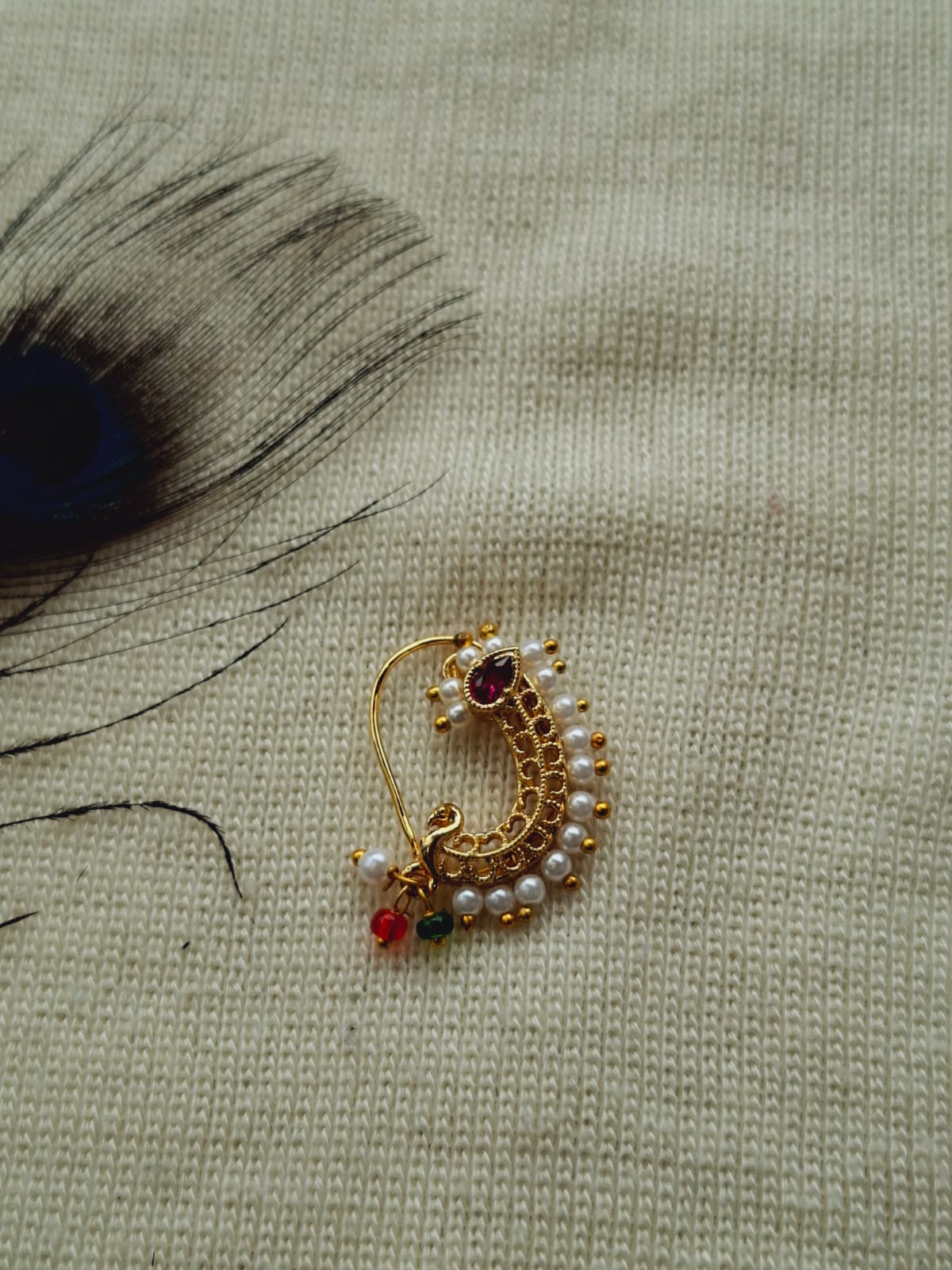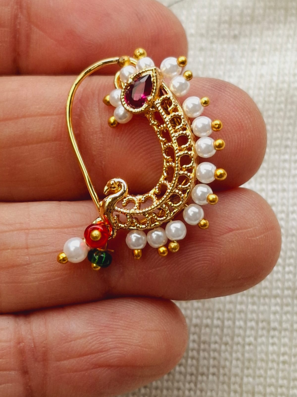 Nath is traditional maharasthrian design but over the period the popularity of Nath has gone on national as well as international level. There are now a days various designs and various colour combintions in Nath. There are various types of nath as well. This is a Classic Pearl Nath which look good on any kind of attire. Generally looks good on oval face.