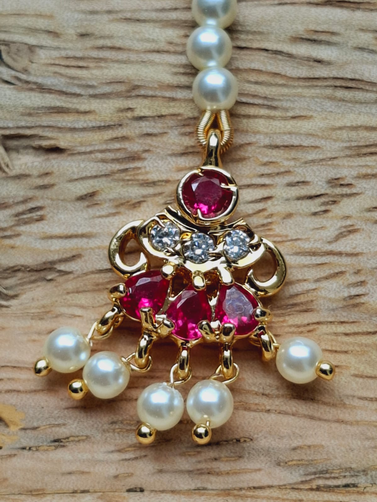 A maang tikka Which is also called Bindi in Marathi is a traditional piece of head jewellery that is worn by South Asian women on their wedding day or for other significant cultural events. It is a centrepiece that is latched onto the forehead, attached to a chain that is pinned into the hair.