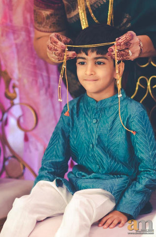 Elegant Mundavali 3 headpiece adorns young Indian girl's vibrant teal outfit in traditional setting