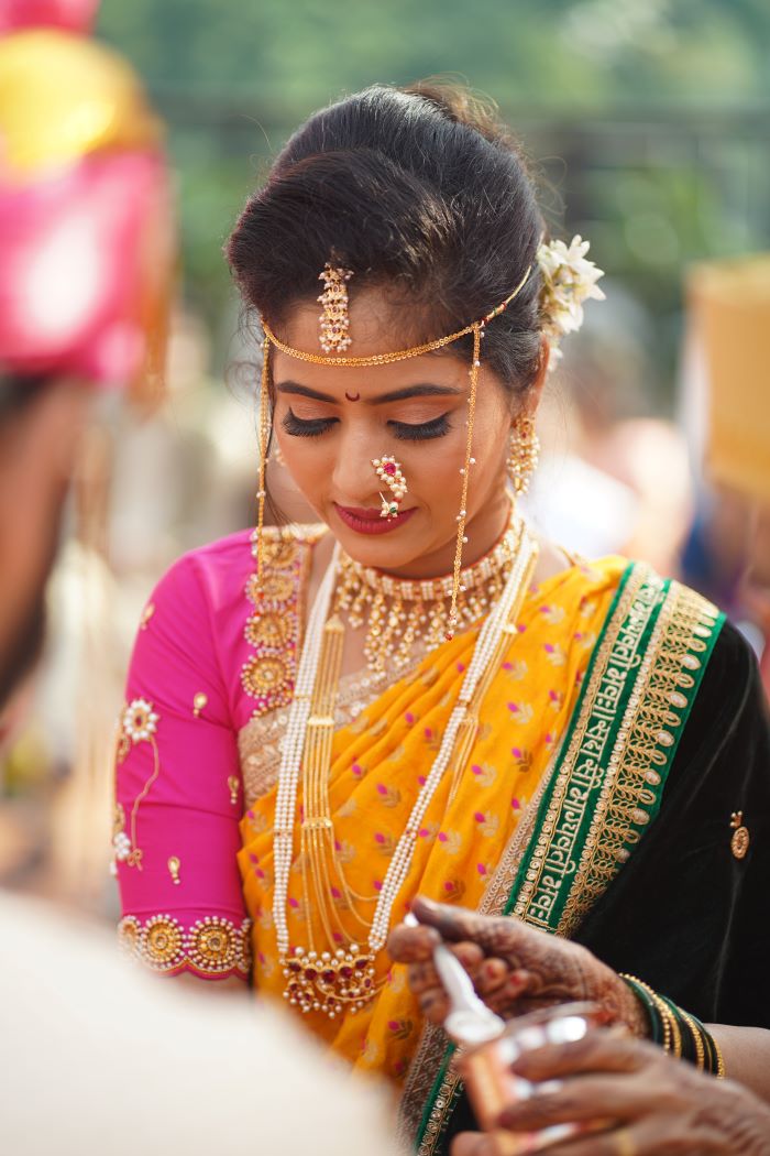 Elegant Indian bride in vibrant pink and yellow saree, adorned with traditional jewelry and floral accents, holding a mobile phone.