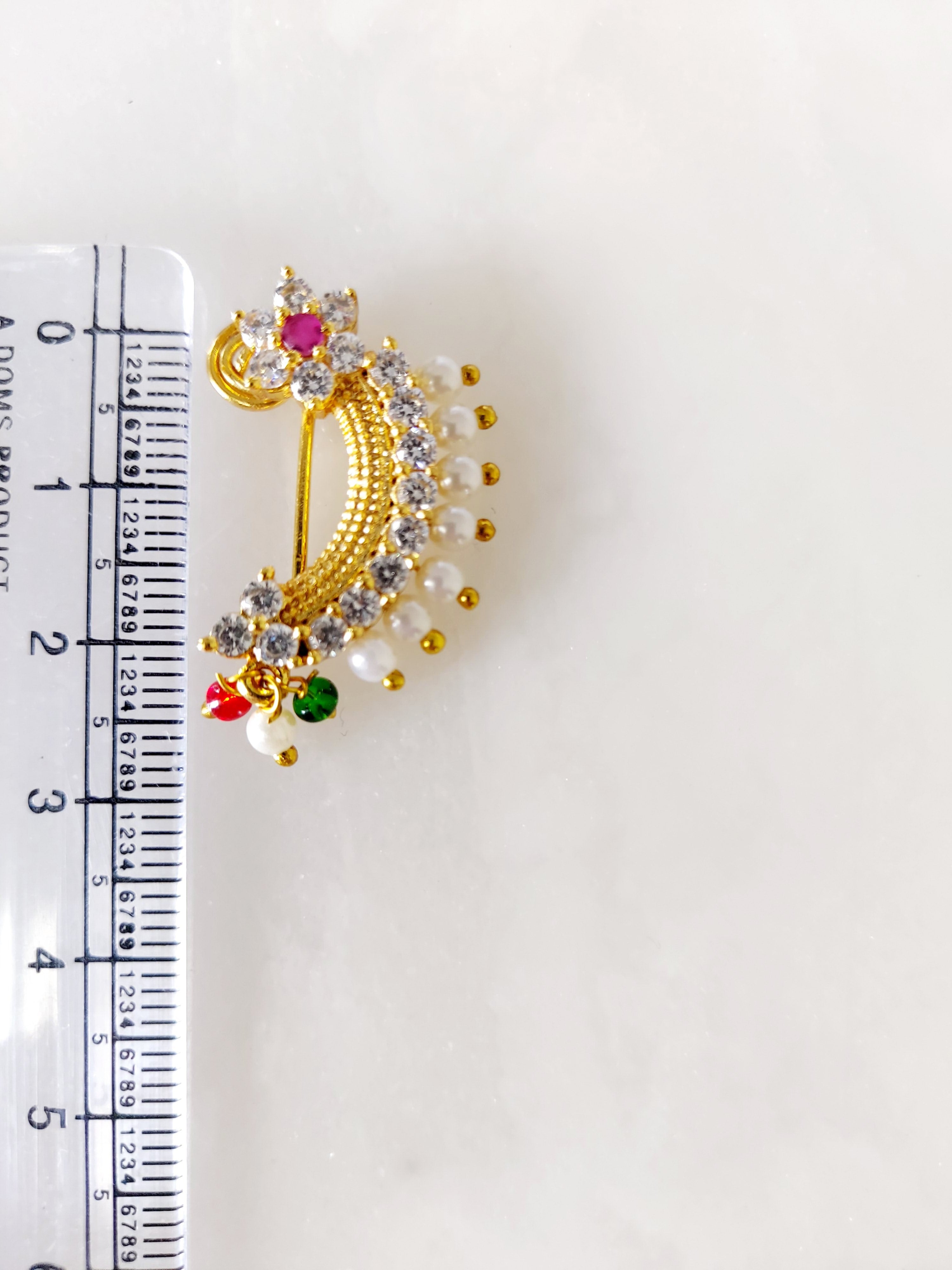 Nath is a traditional Maharashtrian ornament. However, over the past decade, the popularity of this ornament has spread far & wide nationally as well as internationally. Nowadays, the Nath is available in various designs & colors. This is a classical pearl Nath that looks good on any attire.