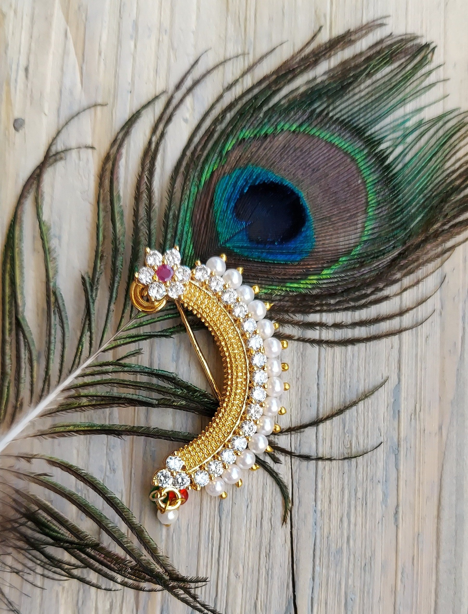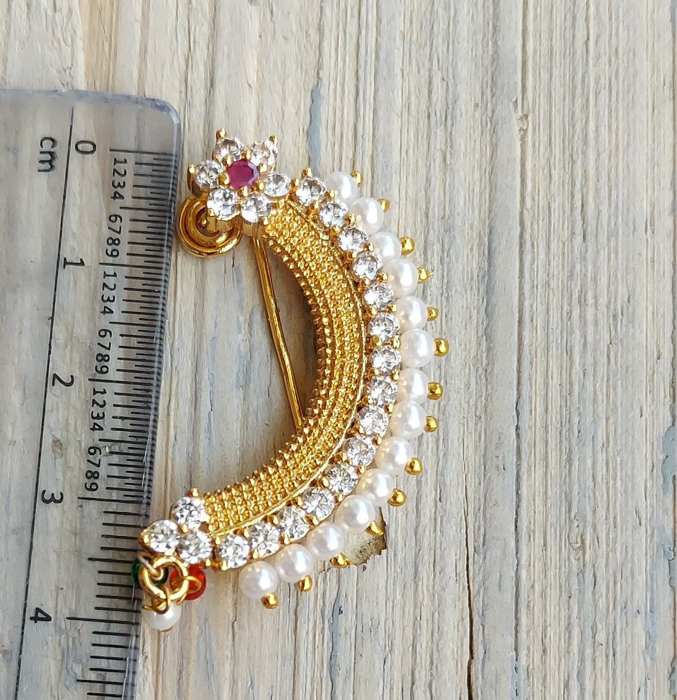 Nath is a traditional Maharashtrian ornament. However, over the past decade, the popularity of this ornament has spread far & wide nationally as well as internationally. Nowadays, the Nath is available in various designs & colors. This is a classical pearl Nath that looks good on any attire.