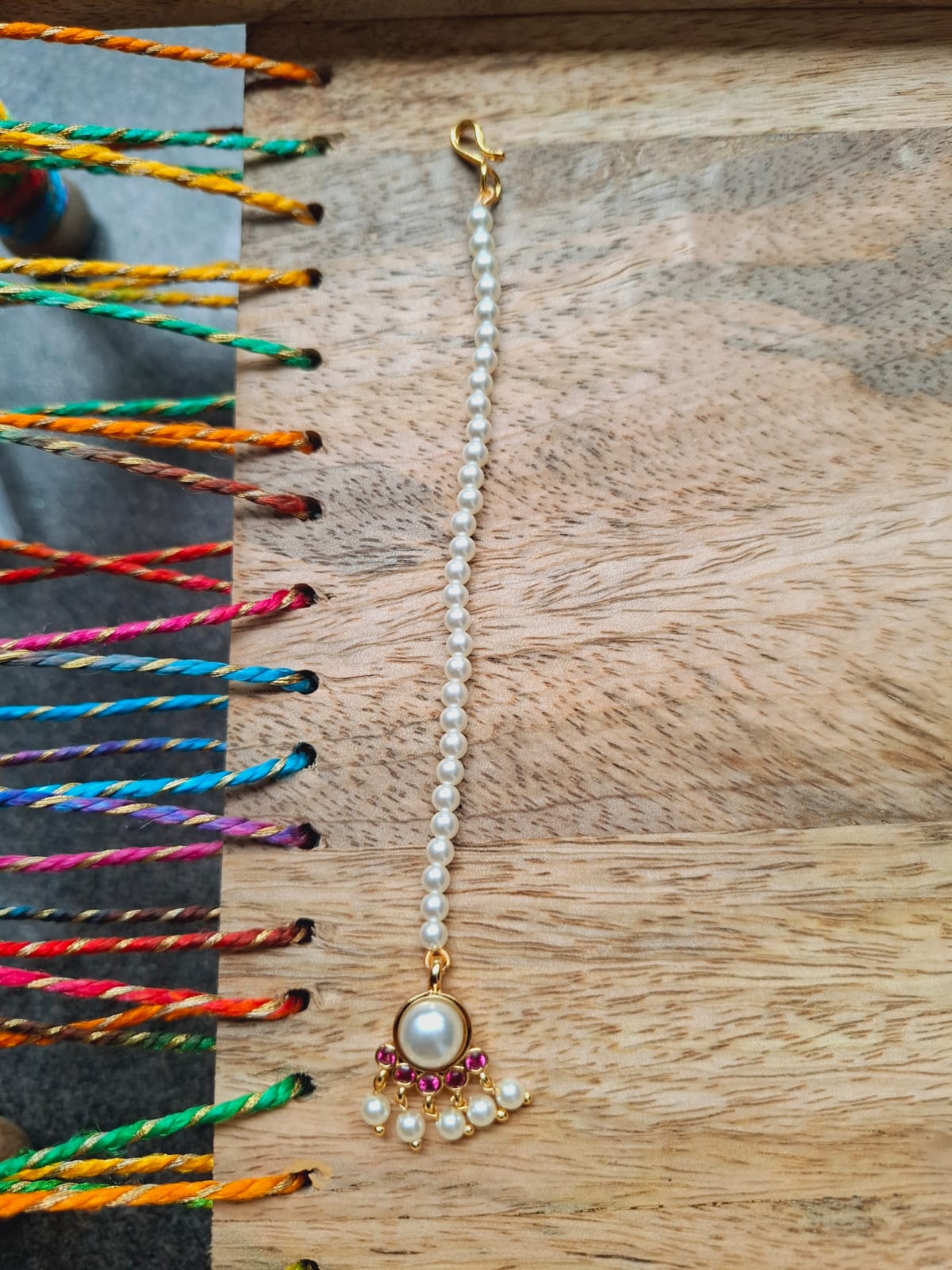 A maang tikka Which is also called Bindi in Marathi is a traditional piece of head jewellery that is worn by South Asian women on their wedding day or for other significant cultural events. It is a centrepiece that is latched onto the forehead, attached to a chain that is pinned into the hair.