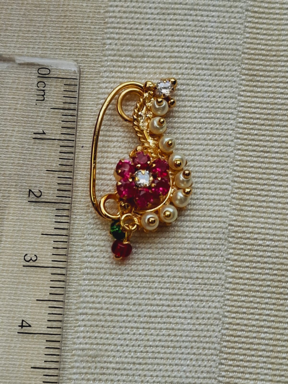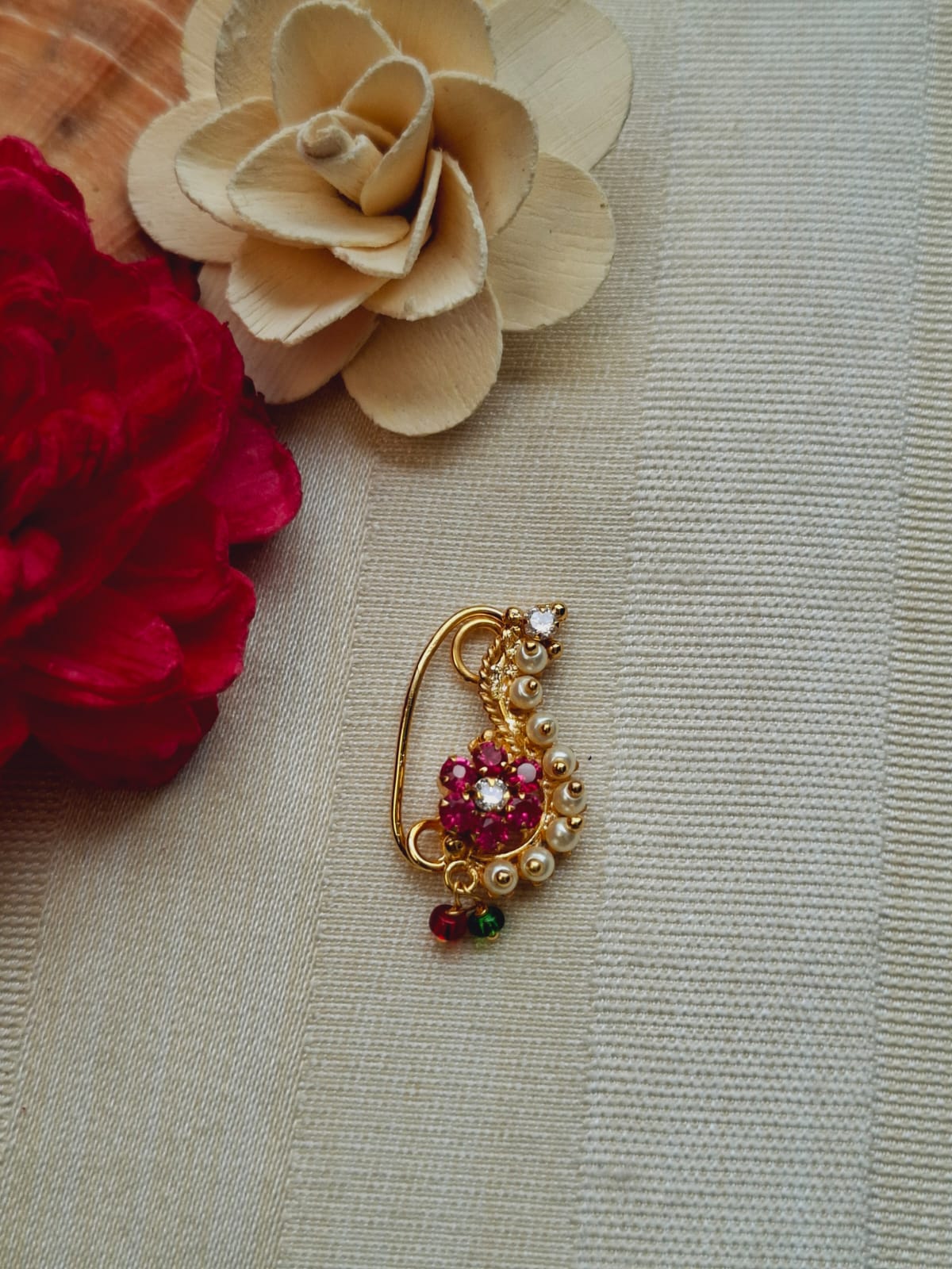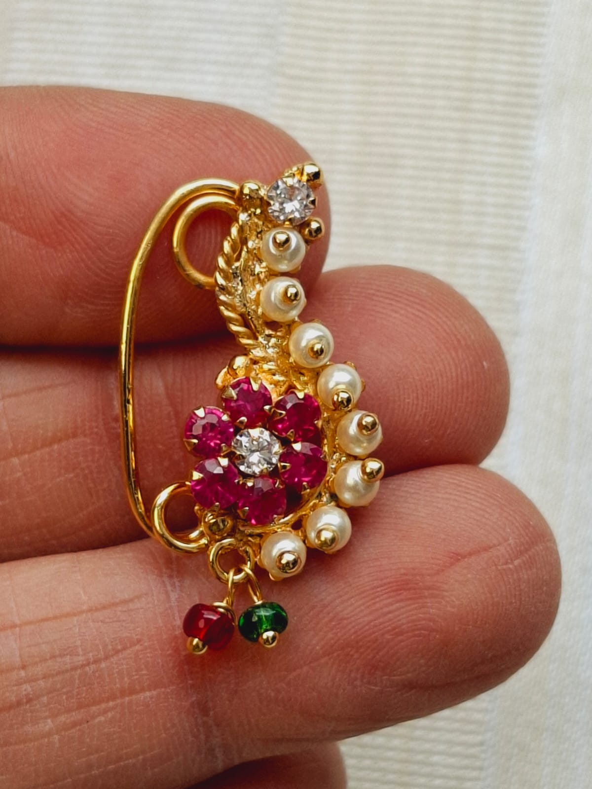 Nath is traditional maharasthrian design but over the period the popularity of Nath has gone on national as well as international level. There are now a days various designs and various colour combintions in Nath. There are various types of nath as well. This is a Classic Pearl Nath which look good on any kind of attire. Generally looks good on oval face.