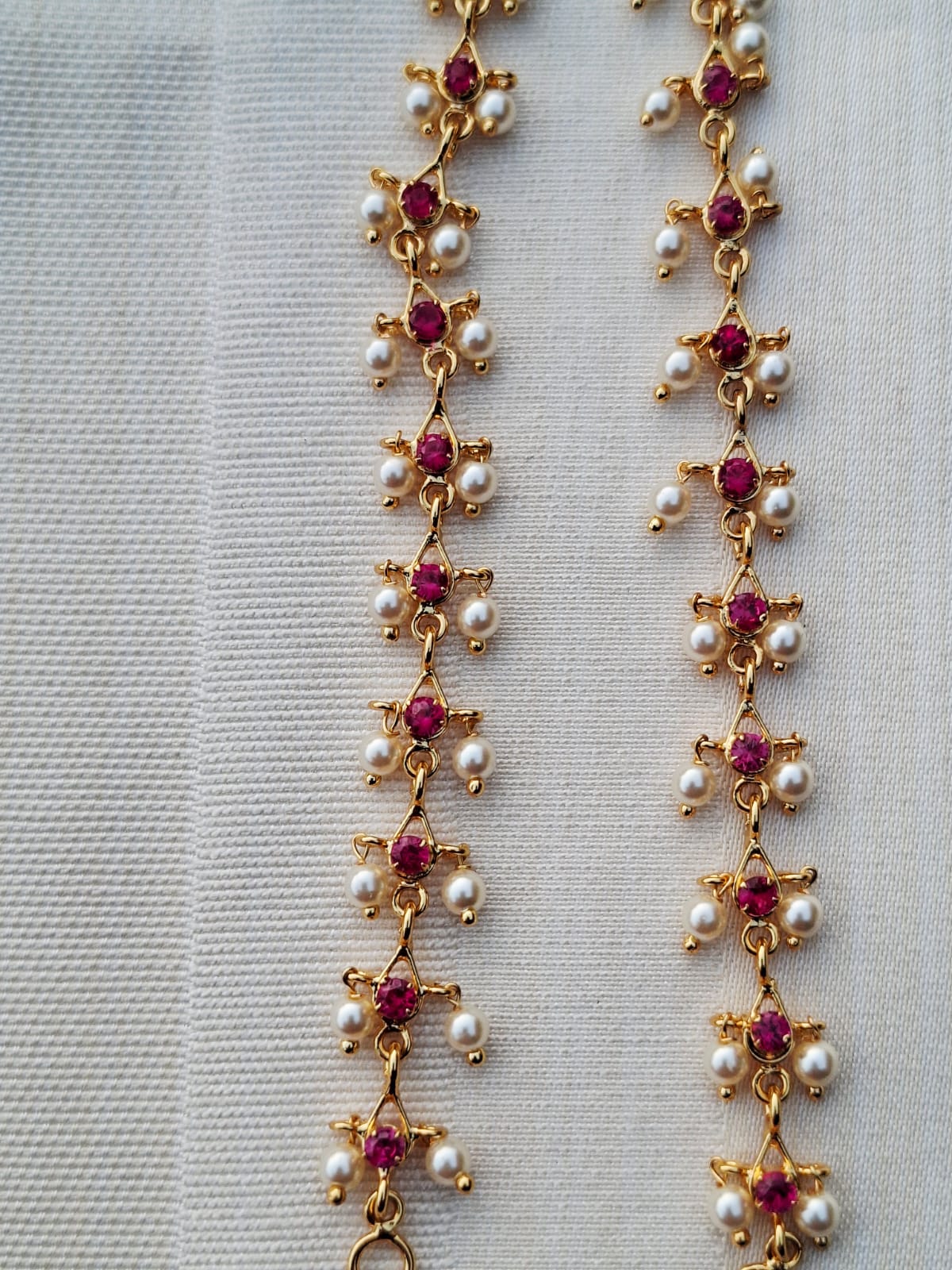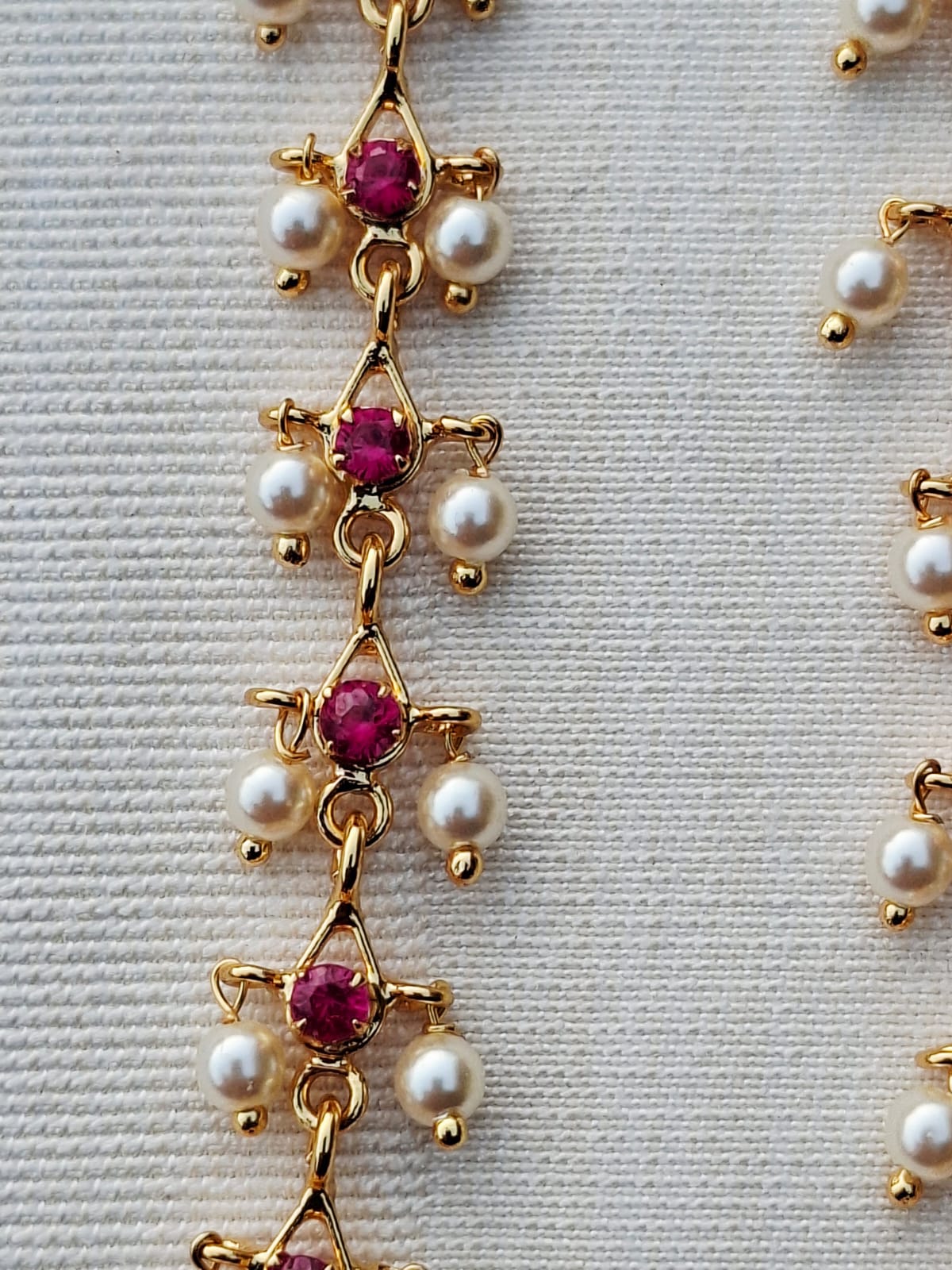 This piece is a single-layered pearl wel with red & white American diamonds.