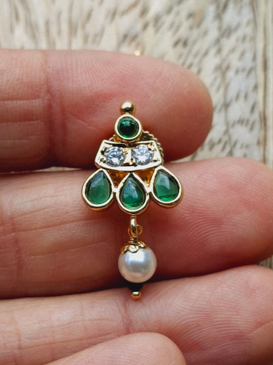 A half-moon shaped handcrafted Tanmani with leaves is in high demand these days. This unique piece will definitely enhance the beauty of your attire! This pendent has been paired with number 5 pearls, which are making it look fabulous!