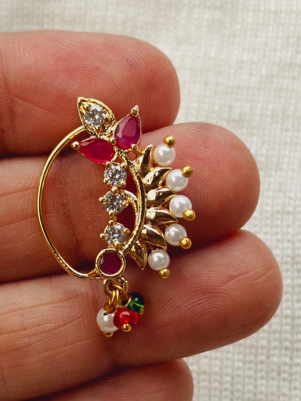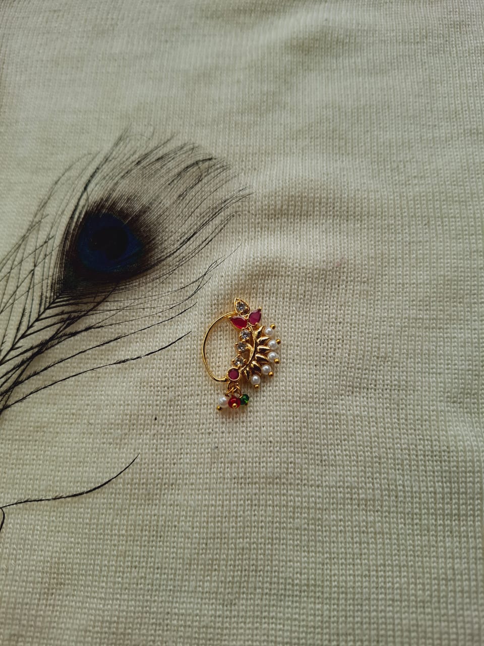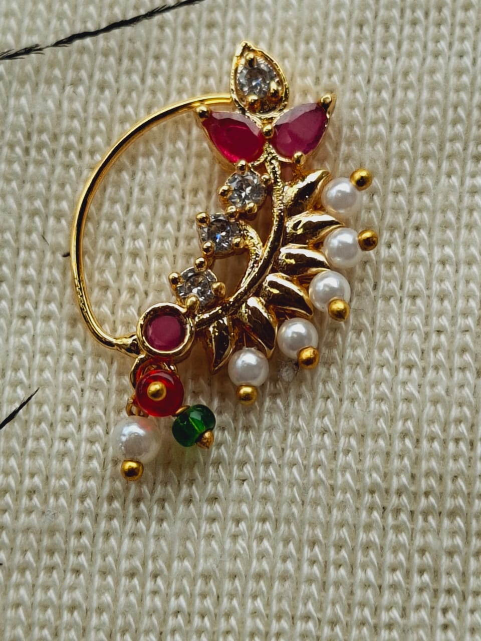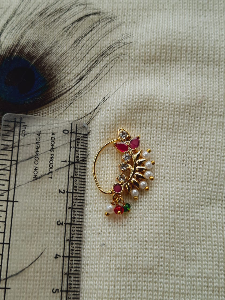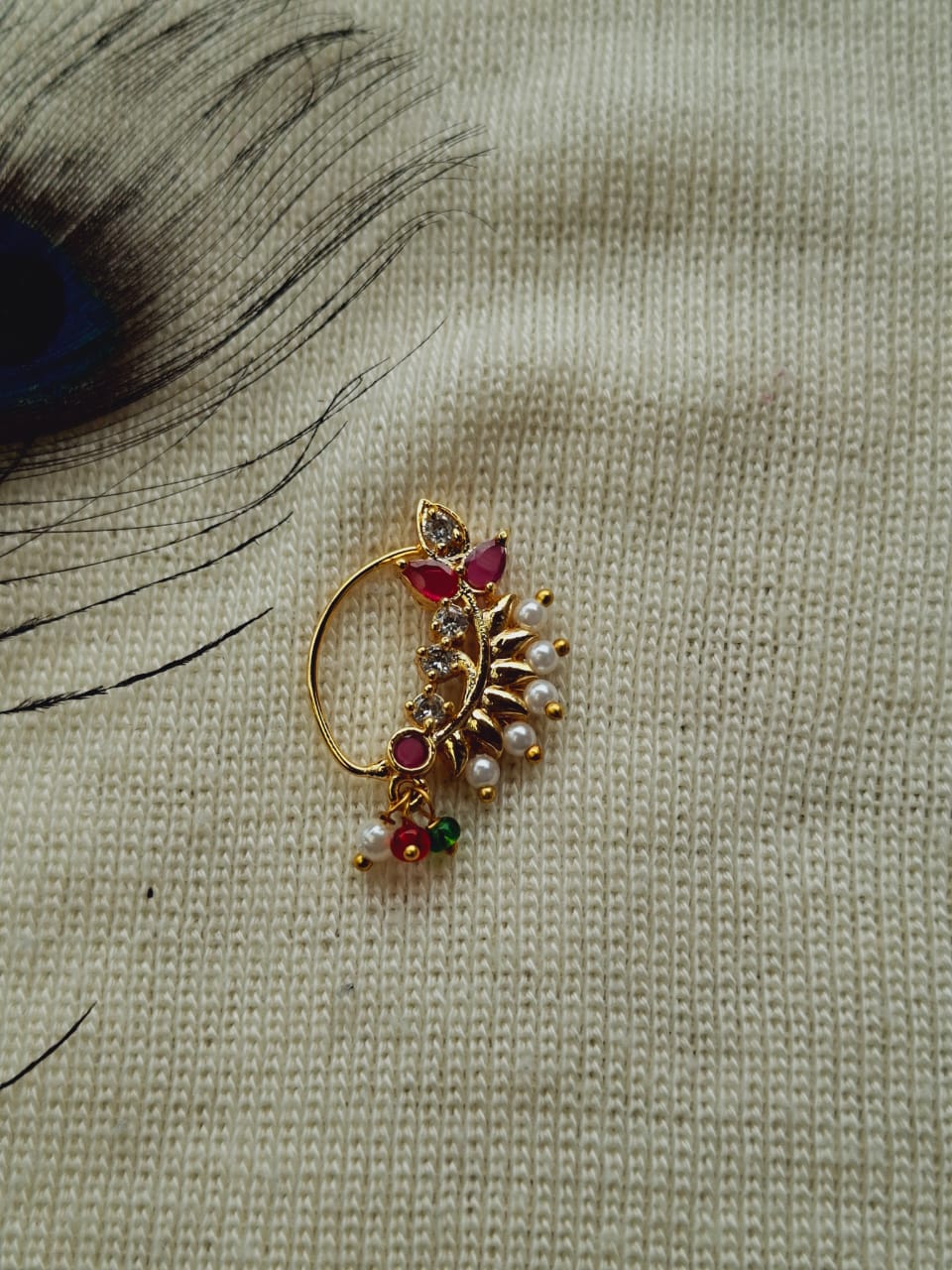 Nath is traditional maharasthrian design but over the period the popularity of Nath has gone on national as well as international level. There are now a days various designs and various colour combintions in Nath. There are various types of nath as well. This is a Classic Pearl Nath which look good on any kind of attire. Generally looks good on oval face.