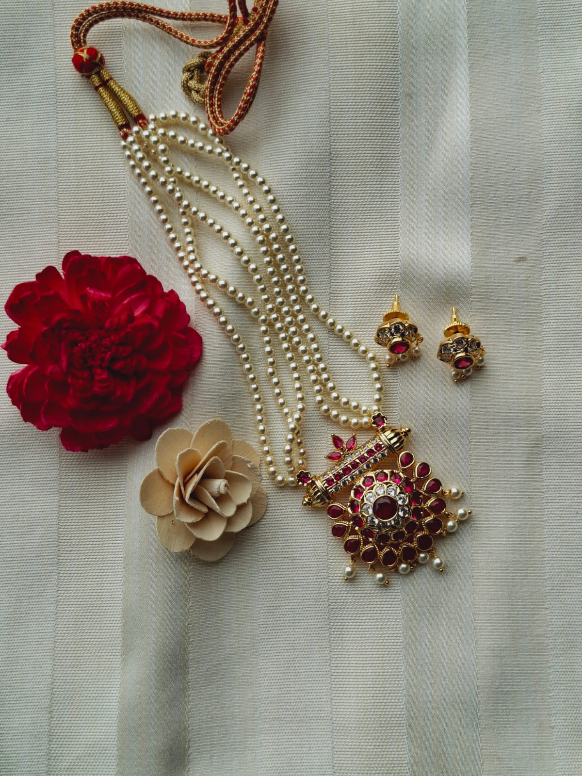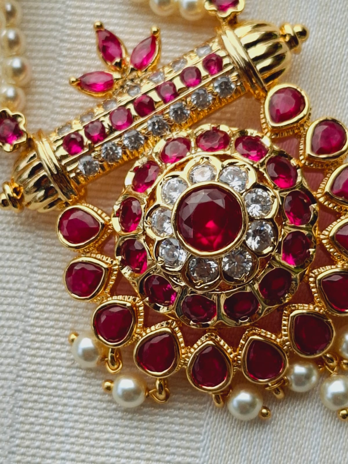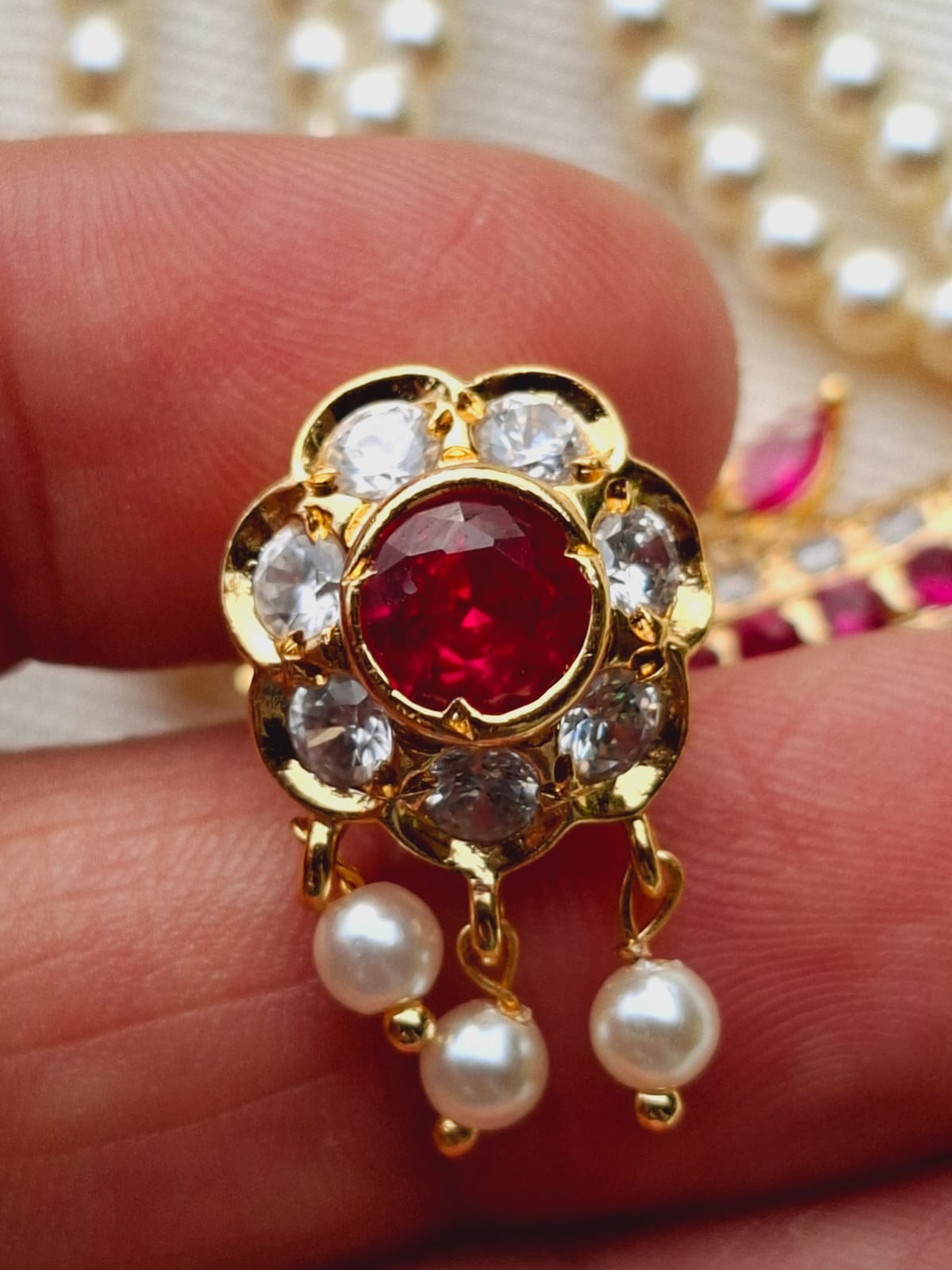 A half-moon shaped handcrafted Tanmani with leaves is in high demand these days. This unique piece will definitely enhance the beauty of your attire! This pendent has been paired with number 5 pearls, which are making it look fabulous!