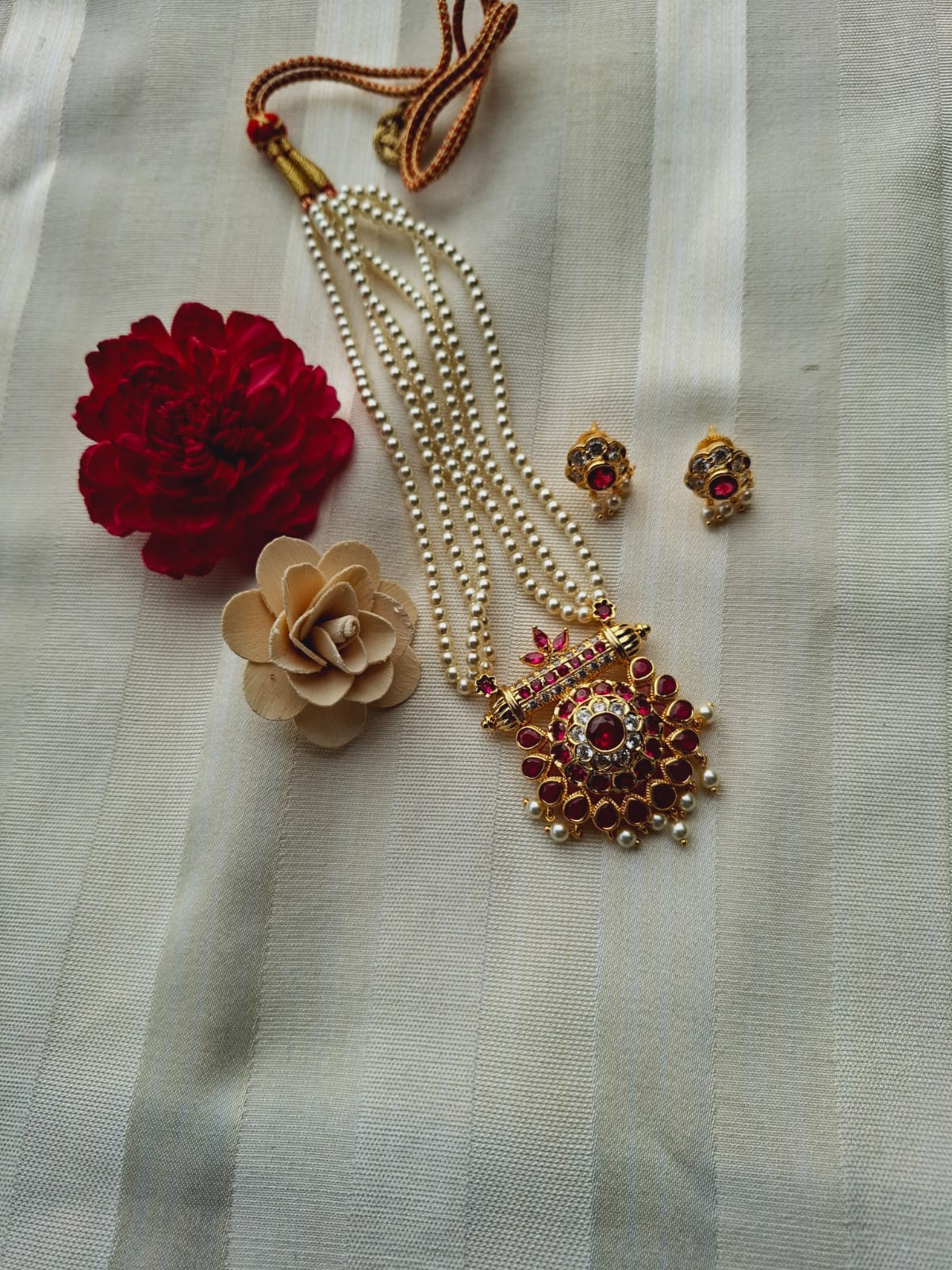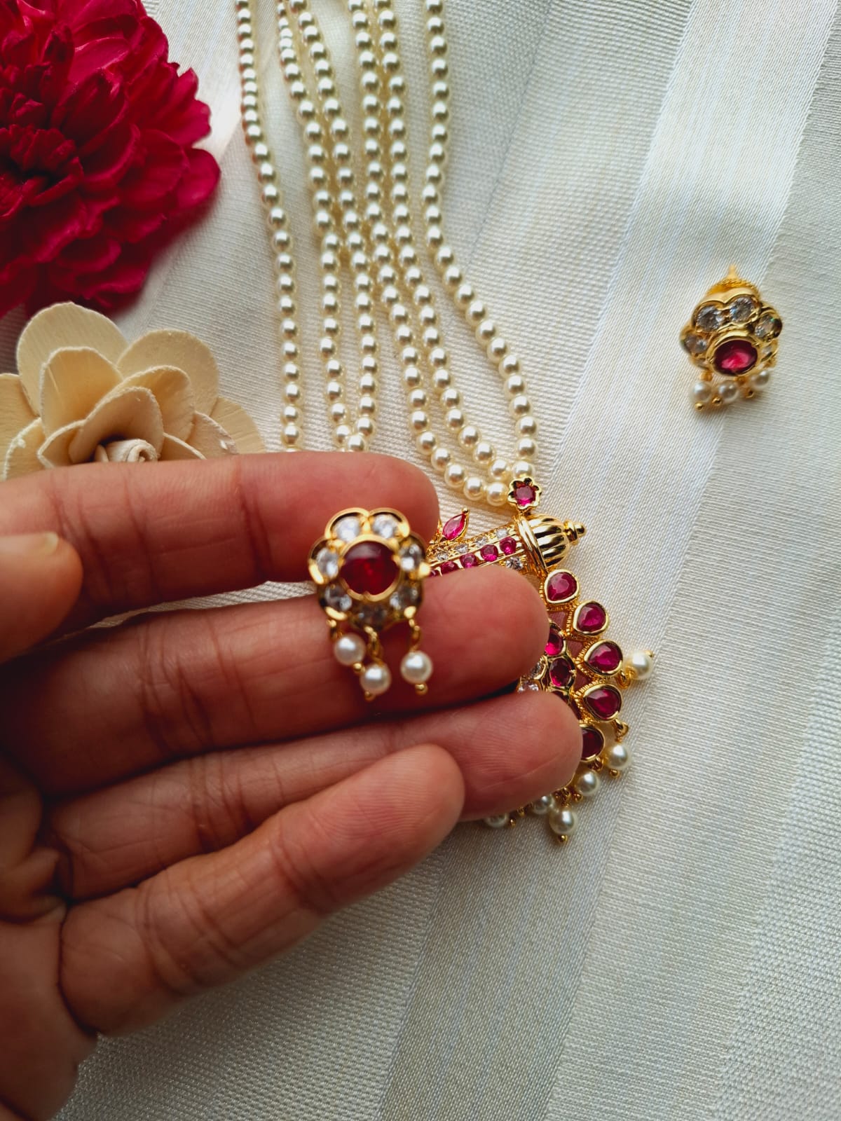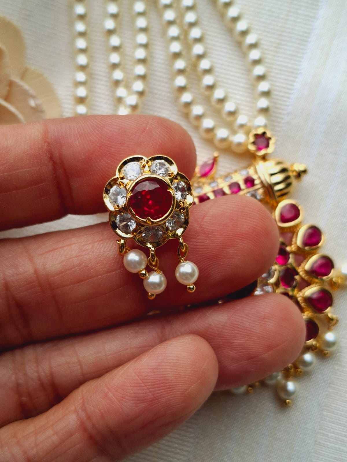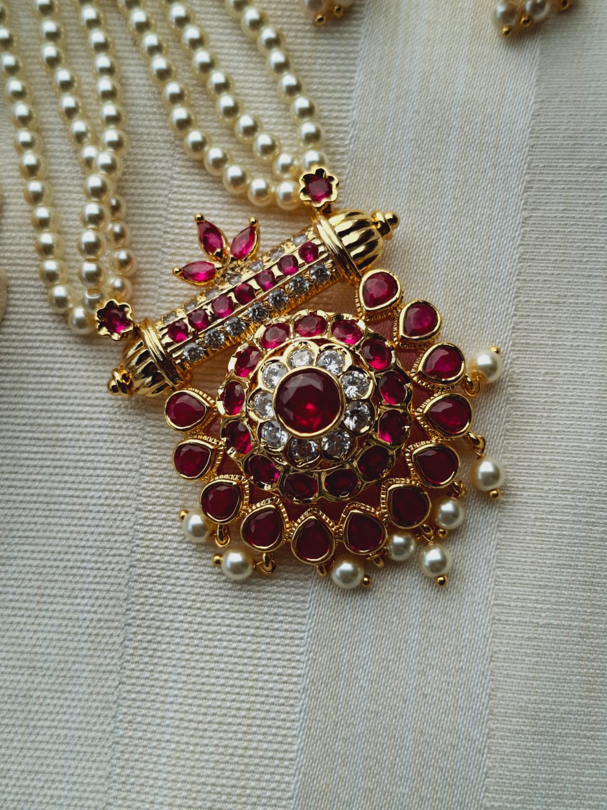 A half-moon shaped handcrafted Tanmani with leaves is in high demand these days. This unique piece will definitely enhance the beauty of your attire! This pendent has been paired with number 5 pearls, which are making it look fabulous!